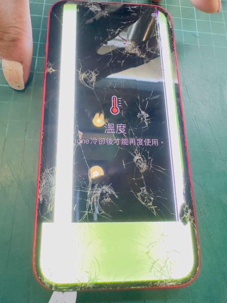這位客戶的iPhone 14雨天摔機進水後手機顯示溫度異常外加螢幕破裂,我們進行了螢幕更換及內部清潔,最終手機恢復正常運作。