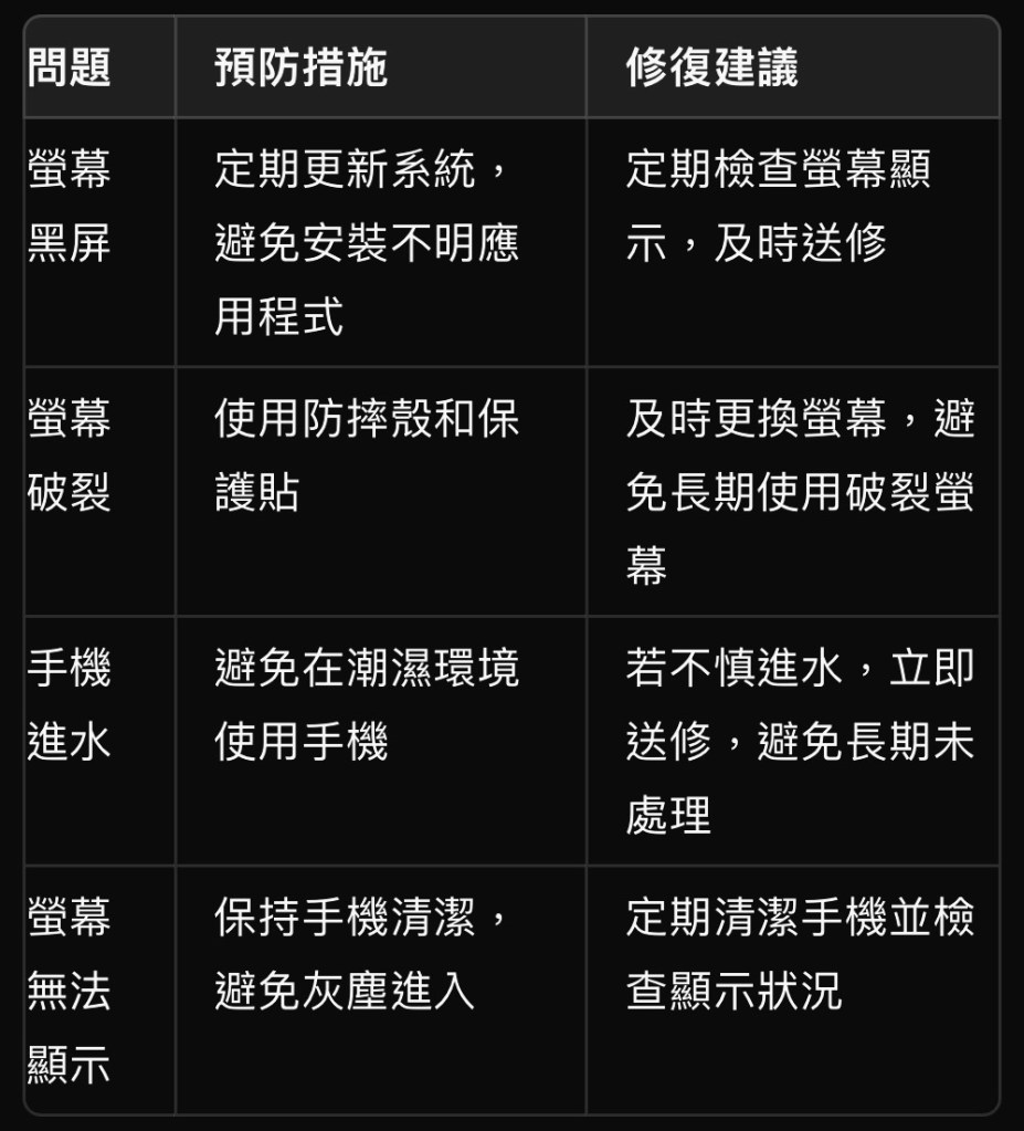 如何延長手機壽命及防止螢幕壞掉的分析表格