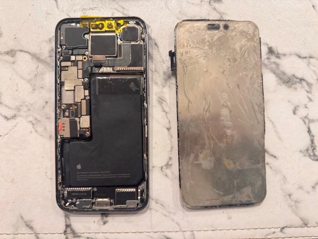 一位客戶的 iPhone 15 Pro Max 從樓梯摔落後,螢幕出現嚴重裂痕且無法觸控,中框因撞擊變形,背蓋玻璃也碎裂。由於中框變形可能擠壓內部元件,我們採取以下步驟: